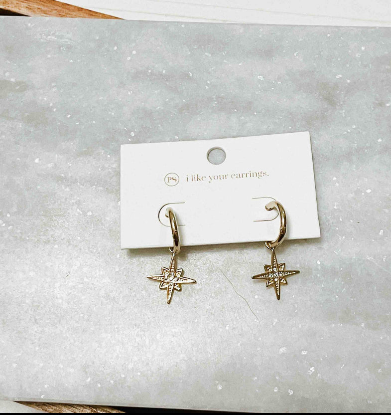 The stars resemble the North Star, contain zircons throughout them, and are the perfect size to wear with other small hoop earrings.