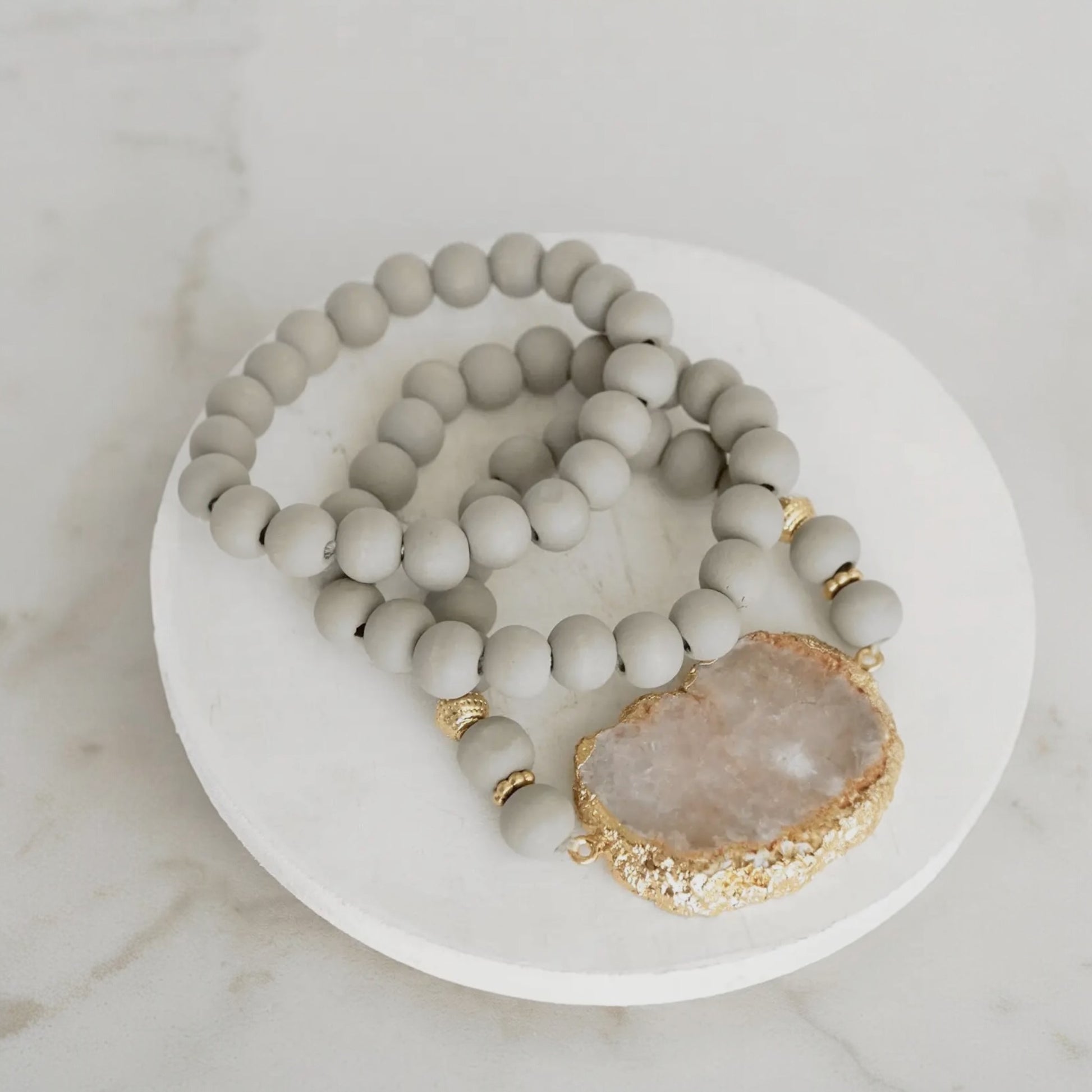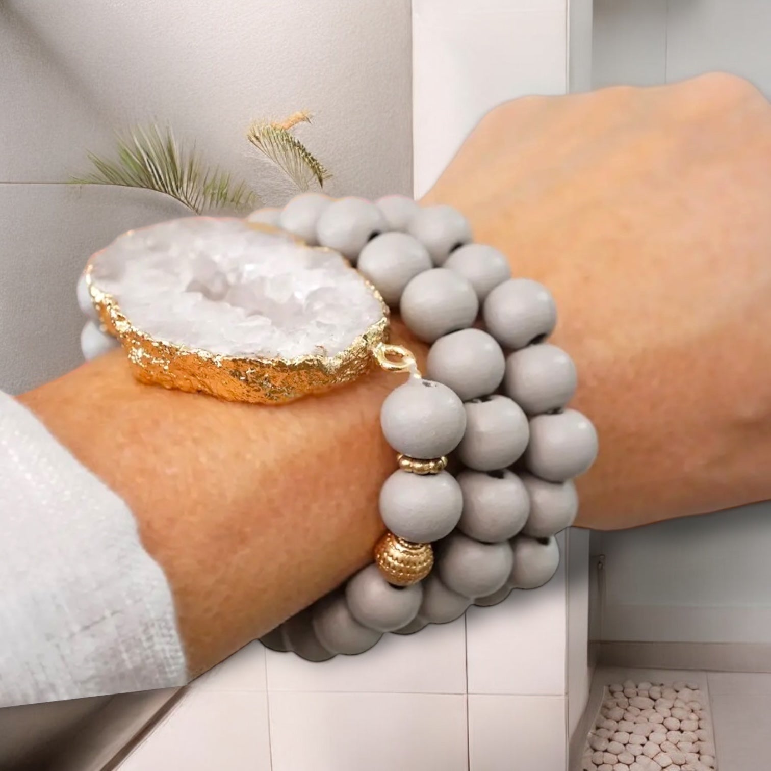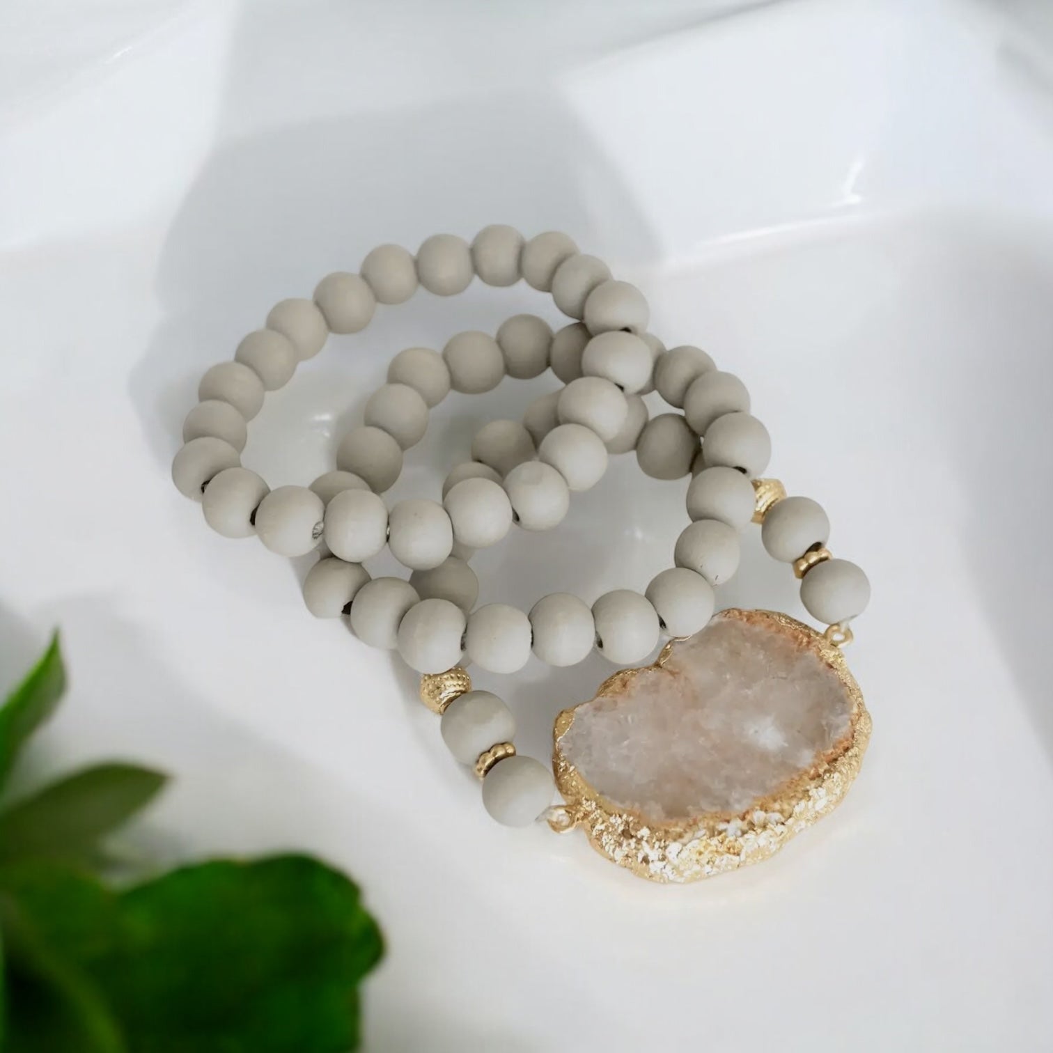 These stunning bracelets feature a natural sliced stone sourced from Arizona, beautiful wooden beads that are polished to perfection, then carefully hand painted adding unique texture with each brush stroke.